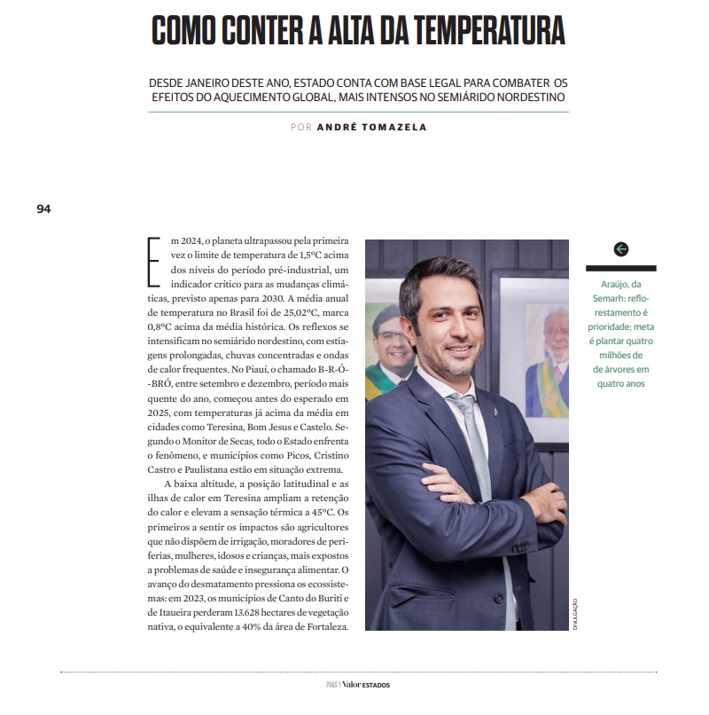 Em meio aos desafios do aquecimento global, o Governo do Piauí ganhou reconhecimento nacional por suas políticas inovadoras de enfrentamento às mudanças climáticas. A edição de outubro da revista Valor Estados (publicação especial da revista Valor Econômico, do Grupo Globo), destacou o protagonismo do estado na agenda ambiental brasileira.
