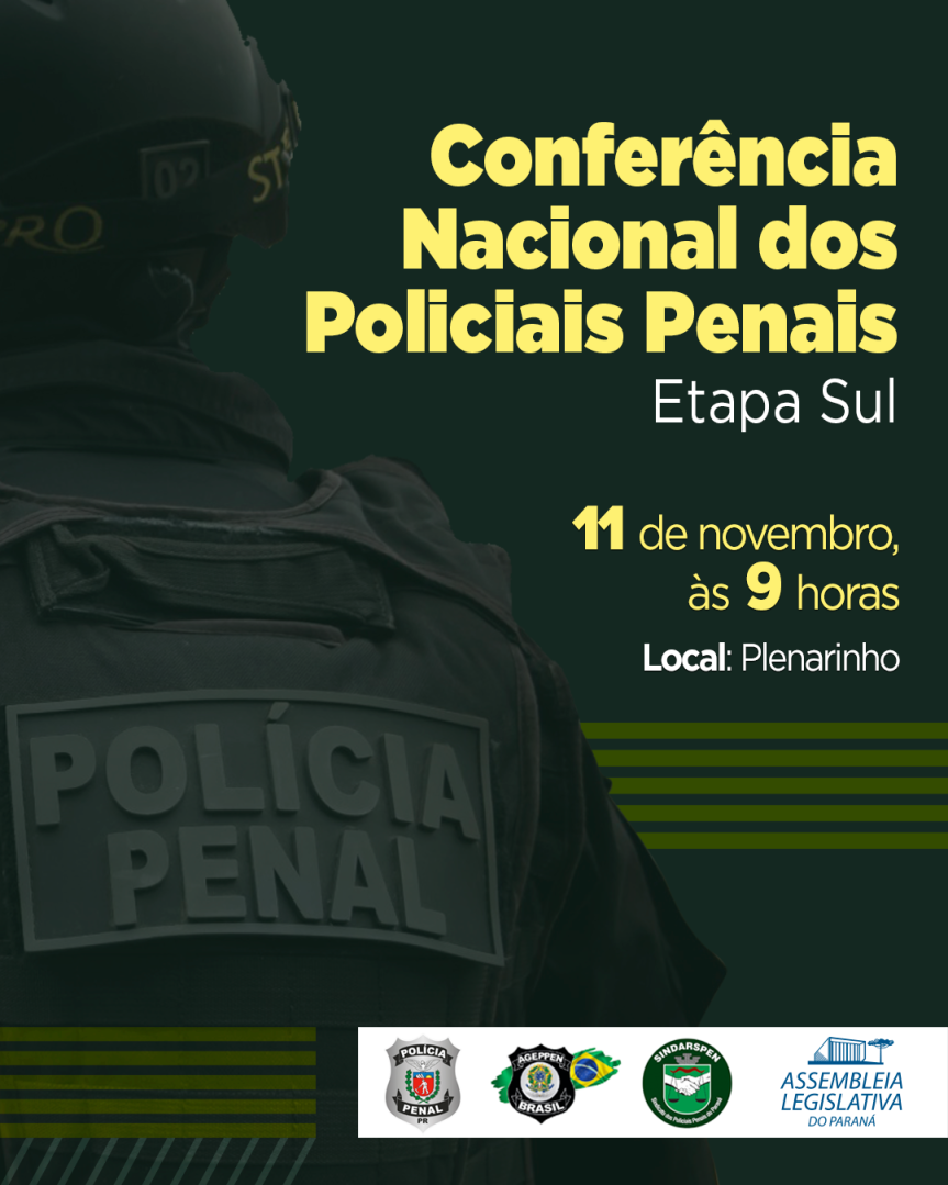 A Assembleia Legislativa do Paraná recebe, na próxima terça-feira (11), a Etapa Sul da II Conferência Nacional da Polícia Penal. O evento será realizado no Plenarinho da Casa de Leis, a partir das 9 horas, e é organizado pelo Sindicato dos Policiais Penais do Paraná (Sindarspen), pela Associação dos Policiais Penais do Brasil (Ageppen/Brasil), pelo Departamento de Polícia Penal do Paraná (Deppen/PR) e pela Liderança do Governo, comandada pelo deputado Hussein Bakri (PSD).