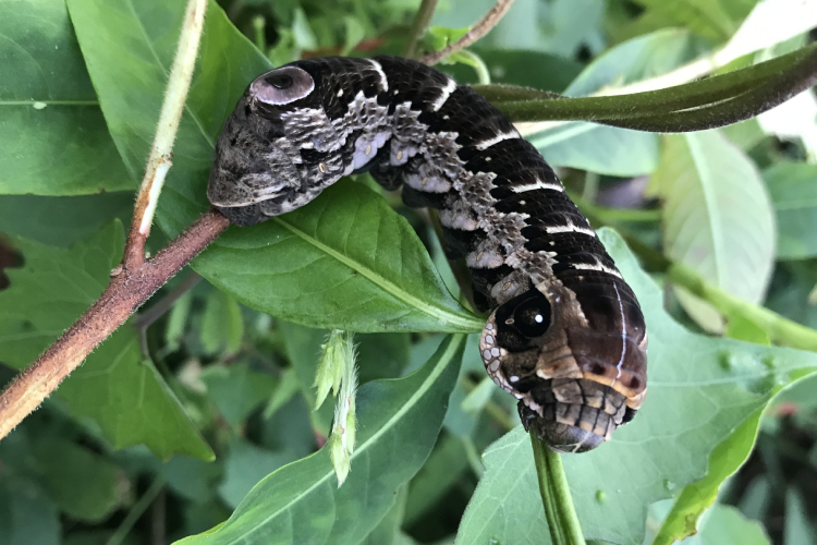 Outra “cosplay de cobra” é a lagarta Eumorpha labruscae, também da América Latina. Ela tem coloração marrom e preta e, quando ameaçada, esconde a pequena cabeça dentro do tórax e expande essa região para simular uma cabeça de serpente.
