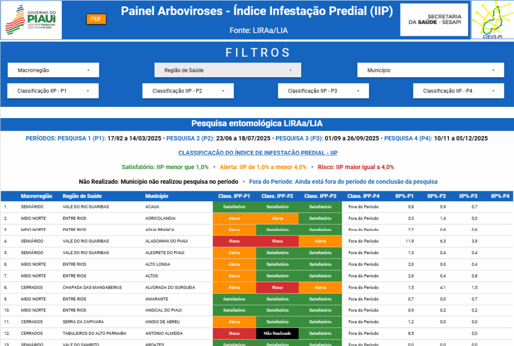Os dados da 3ª etapa da pesquisa entomológica LIRAa/LIA, referente ao ano de 2025, mostram que 189 municípios do Piauí foram classificados com índice satisfatório quanto à presença larvária dos mosquitos Aedes aegypti e Aedes albopictus. Os números representam uma melhora significativa em relação à primeira etapa da pesquisa, realizada em abril deste ano, quando 116 municípios haviam alcançado o índice satisfatório quanto à presença de larvas dos mosquitos em imóveis.
