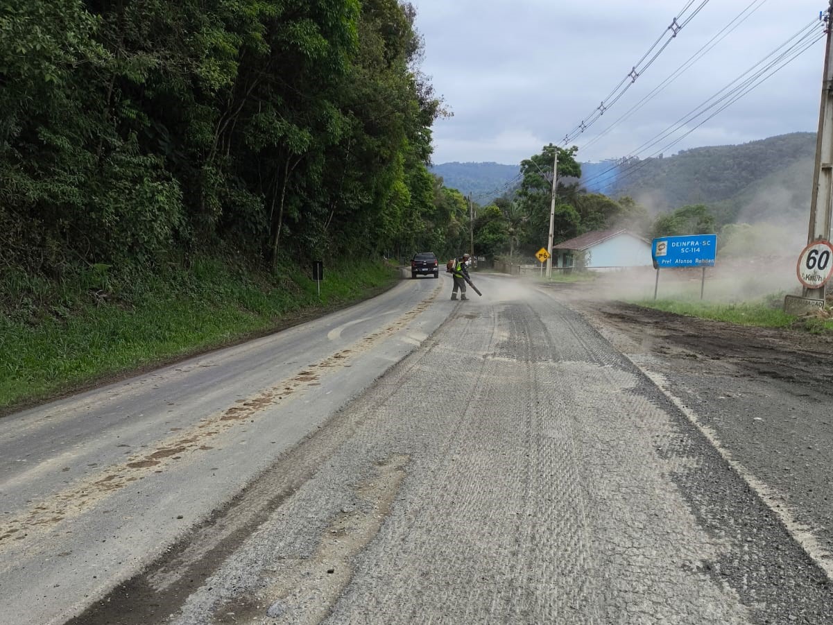 “Decidimos, por determinação do governador Jorginho Mello, revitalizar todo o trecho. A roçada já fizemos, estamos trabalhando na limpeza das bordos, remendos profundos e depois nas canaletas e na sinalização”, explica Jerry Comper, salientando que a SC-114 entre Taió e Salete recebe grande fluxo de caminhões. A região é forte na indústria madeireira, na suíno e avicultura e também na fumicultura.