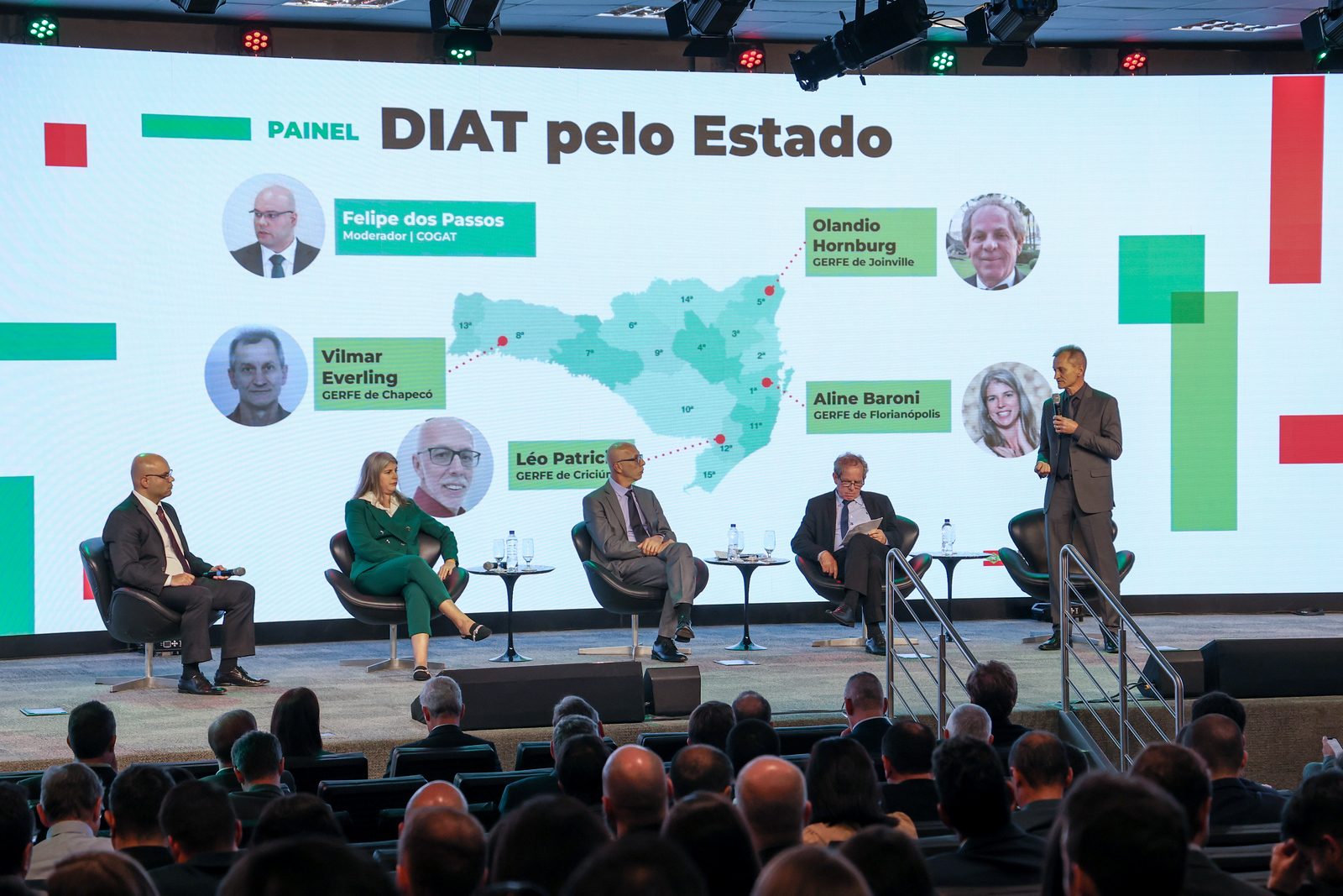 Diferentes regiões atendidas pelo Fisco catarinense estiveram representadas no painel DIAT pelo Estado, que contou com a participação dos gerentes regionais da SEF Vilmar Everling (Chapecó), Léo Patricio (Criciúma), Olandio Hornburg (Joinville) e Aline Baroni (Florianópolis). A mediação ficou por conta do consultor de Gestão de Administração Tributária, Felipe dos Passos.