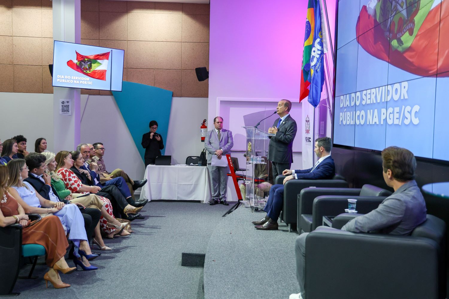 Em celebração ao Dia do Servidor Público, a Procuradoria-Geral do Estado de Santa Catarina (PGE/SC) promoveu um evento em homenagem a seus servidores. A atividade contou com a presença do governador Jorginho Mello e reuniu, na tarde desta sexta-feira, 24, mais de 250 pessoas no auditório do Conselho Regional de Contabilidade (CRC/SC), em Florianópolis.