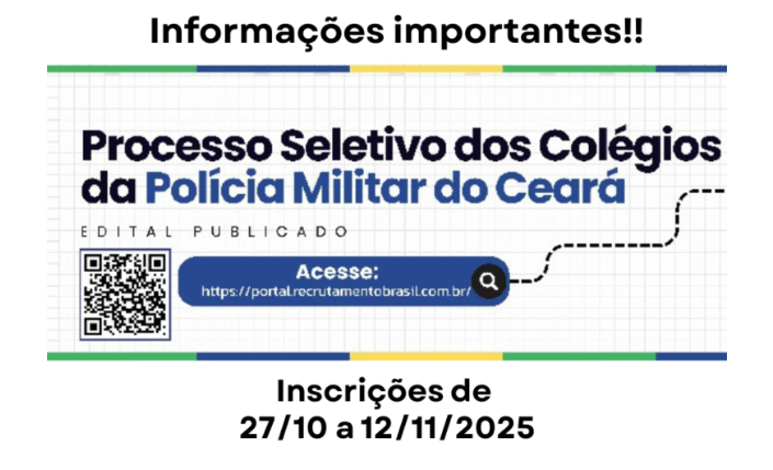 O Processo Seletivo 2025 para ingresso nos Colégios da Polícia Militar do Ceará (CPM) e no Colégio Militar do Corpo de Bombeiros Escritora Rachel de Queiroz (CMCB) está com inscrições abertas para o ano letivo de 2026.