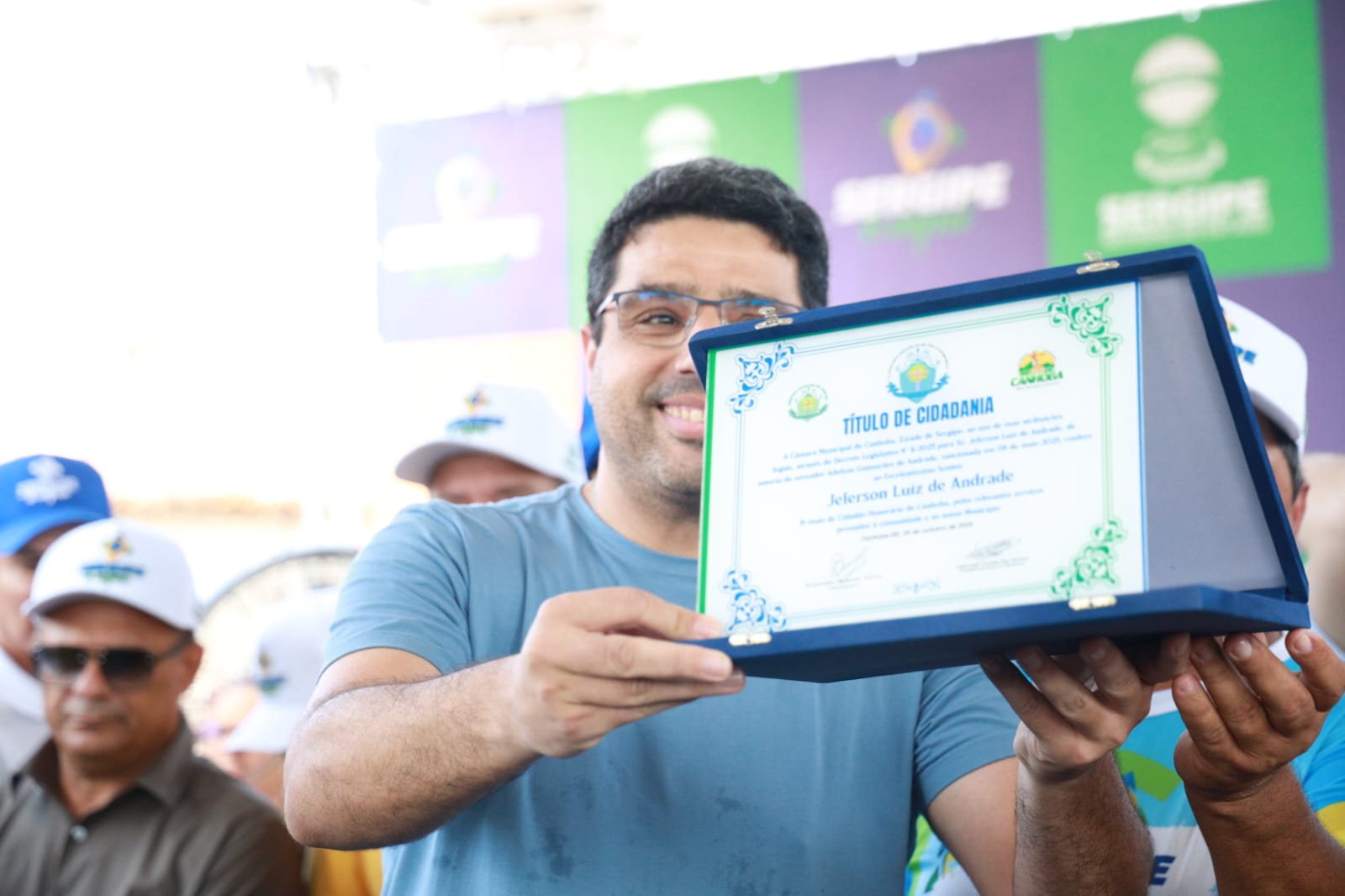 O presidente da Alese, Jeferson Andrade, expressou gratidão ao receber o Título de Cidadão Canhobense das mãos do prefeito Chrystophe Divino. “Receber das mãos do prefeito Chrystophe Divino o Título de Cidadão Canhobense é uma honra que guardarei com profundo carinho e gratidão. Canhoba tem um significado especial para mim e para minha família, é uma terra de gente trabalhadora, de valores firmes e de um sentimento de pertencimento muito forte”, declarou.