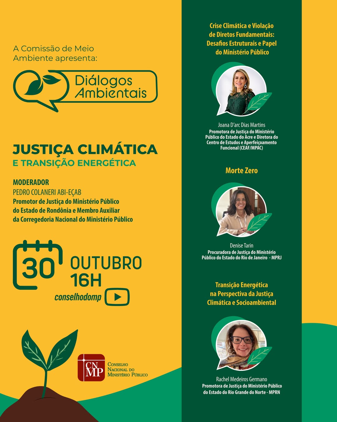 Em um cenário em que os efeitos da crise climática são cada vez mais perceptíveis e a busca por fontes limpas de energia se torna urgente, o Conselho Nacional do Ministério Público (CNMP) promove um novo encontro de ideias e práticas voltadas à sustentabilidade. O quarto episódio da série Diálogos Ambientais 2025, com o tema “Justiça Climática e Transição Energética”, será realizado em 30 de outubro, às 16h, com transmissão ao vivo pelo canal do CNMP no YouTube.