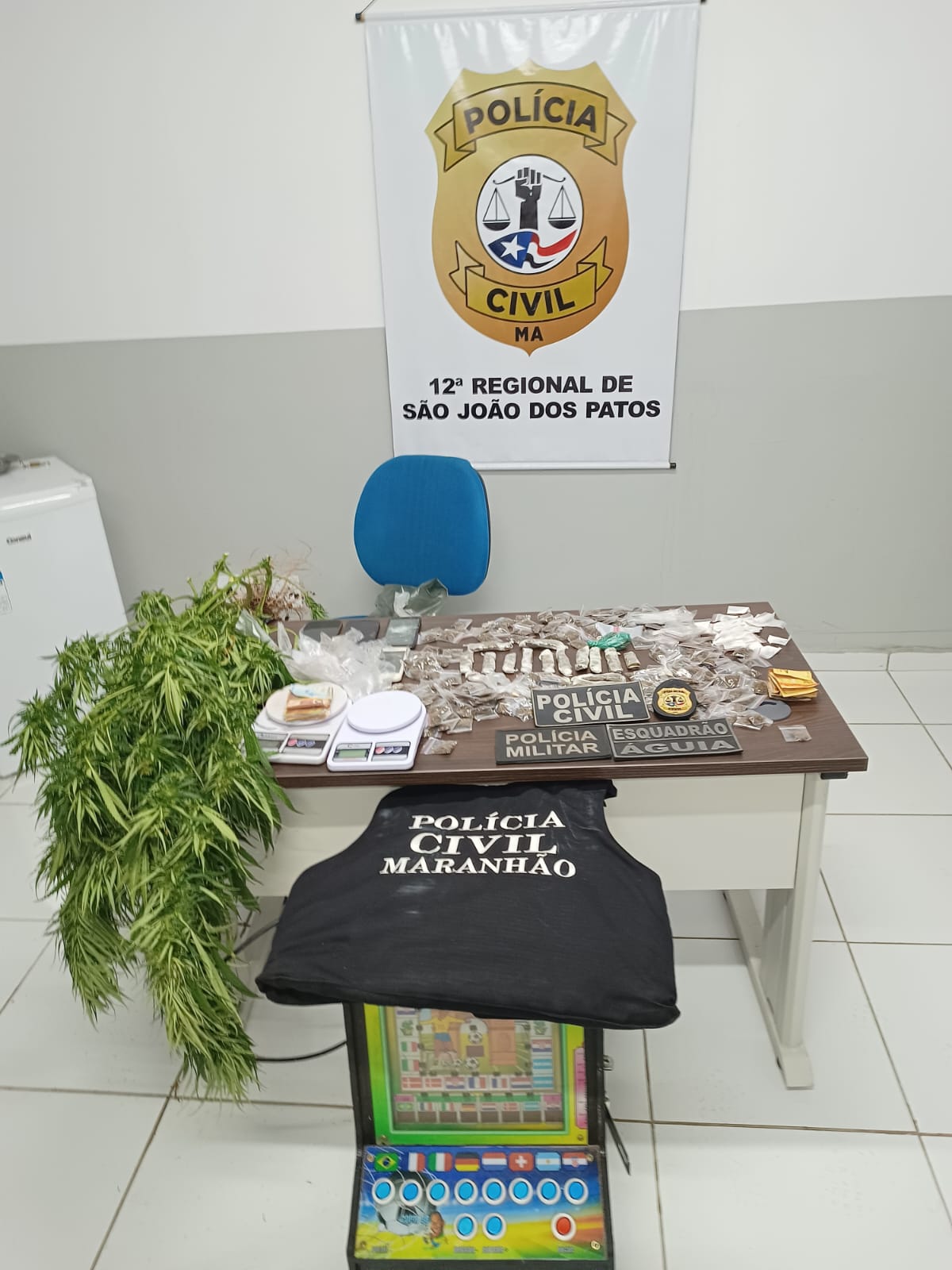 De acordo com a 12ª Delegacia Regional de São João do Patos, durante as buscas no primeiro endereço, os policias localizaram diversos objetos ilícitos, entre eles 196 papelotes de maconha, 17 tabletes de maconha, 36 papelotes de cocaína, 01 balança de precisão, 05 aparelhos celulares e a quantia de 69 reais em espécie.