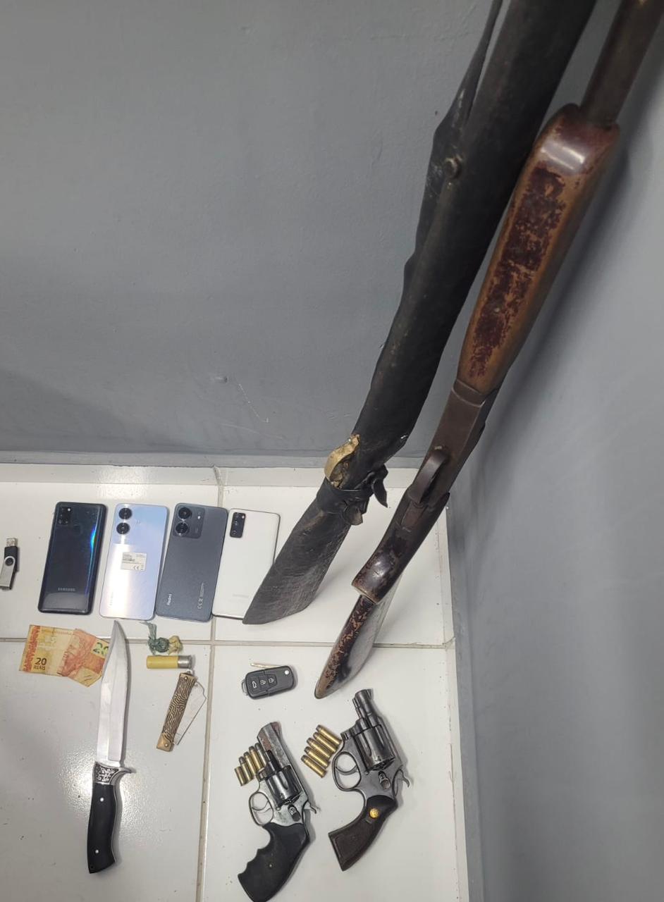 Na operação, foram apreendidas quatro armas de fogo, munições e aparelhos celulares. Quatro pessoas foram presas e autuadas em flagrante por posse ilegal de arma de fogo. Um dos investigados segue foragido e continua sendo procurado pelas forças de segurança.