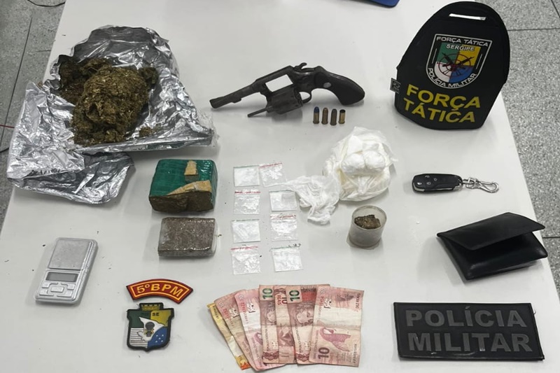 Ainda segundo as informações, o suspeito de 52 anos foi localizado e, na abordagem policial, foram apreendidos um revólver calibre .38 com quatro munições, sendo três deflagradas e uma intacta, além de 610 gramas de maconha e 325 de cocaína.