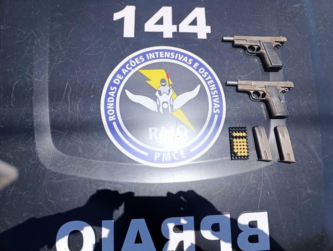 A Polícia Militar do Ceará (PMCE), por meio do Comando de Policiamento de Rondas de Ações Intensivas e Ostensivas (CPRaio), apreendeu duas pistolas calibre 9mm e 19 munições (sendo quatro deflagradas) após disparos de arma de fogo contra policiais militares. O fato aconteceu desse sábado (25), na rua José Barroso, bairro Cidade Nova, no município de Carnaubal.