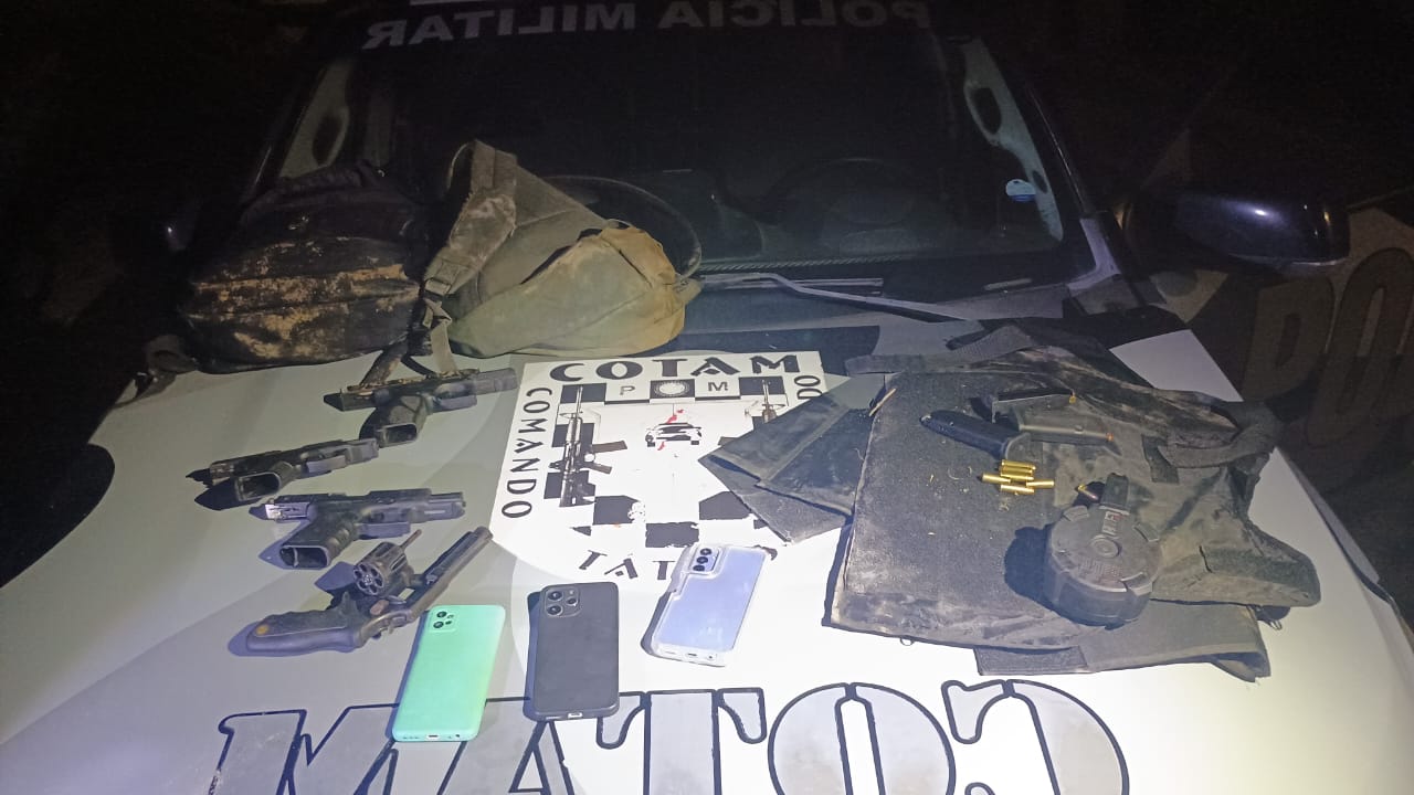 Com o cessar dos disparos, as equipes iniciaram varredura em uma área de mata próxima ao local do confronto. Na ação, foram localizados dois indivíduos feridos e o material ilícito, que incluía três pistolas (duas calibre .380 e uma 9mm), um revólver calibre .38, carregadores, 37 munições, além de 44 gramas de maconha.