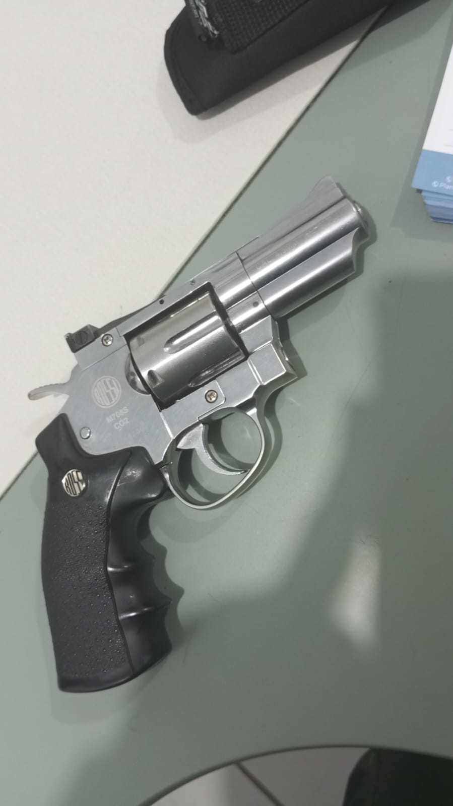 Com base nas informações, a composição policial iniciou o acompanhamento tático do veículo e conseguiu realizar a abordagem na via informada. Durante a busca no interior do automóvel, os policiais localizaram um simulacro de revólver calibre .38, de marca Rossi.