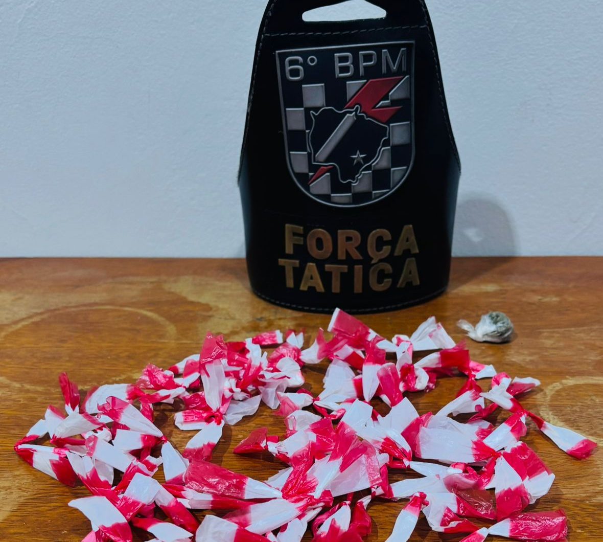 Durante a busca no local, foi localizada a sacola dispensada, que continha 51 trouxinhas de substância análoga à cocaína e 1 trouxinha de maconha. Um adolescente de 17 anos assumiu a propriedade dos entorpecentes, relatando que as porções de cocaína seriam comercializadas por R$ 5,00 cada.
