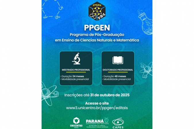 Estão abertas as inscrições para o Programa de Pós-Graduação em Ensino de Ciências Naturais e Matemática (PPGEN) da Universidade Estadual do Centro-Oeste (Unicentro). O prazo segue até o dia 31 de outubro, com oferta de vagas para o ano letivo de 2026 tanto para o Mestrado quanto para o Doutorado Profissional.